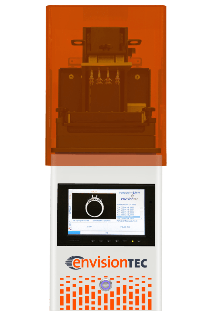 Die patentierte neue bahnbrechende Technologie von EnvisionTEC, Continuous Digital Light Manufacturing, ermöglicht es Juwelieren, 3D-Druckmodelle für das direkte Feingießen in Minuten anstatt Stunden zu erstellen. Der Micro Plus cDLM ist auf die kontinuierliche Bewegung der Bauplatte in Z-Richtung angewiesen, um außergewöhnlich schnelle Aufbauten und eine atemberaubende Auflösung für gießbare Modelle in EnvisionTECs Industriestandard-Gussmaterial PIC 100 zu erzielen. Der Micro Plus cDLM druckt auch in QView, ein noch schneller druckbares Material zur Designüberprüfung für Passform- und Designmodelle, die dem Kunden in wenigen Minuten gezeigt werden können. Zeit ist Geld, und mit einer durchschnittlichen Verarbeitungsgeschwindigkeit von 10 bis 20 Minuten pro Zoll in Z für den gesamten Hülle. Dadurch können Braut- und Moderinge am selben Tag entworfen und für das Feingussverfahren vorbereitet werden.